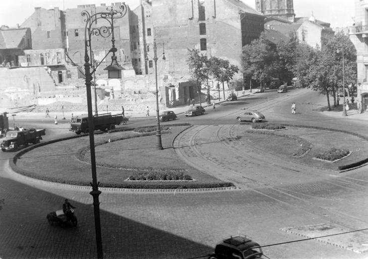 Most, hogy elkészült a Deák tér és a Károly körút átépítése, időszerű egy archív kép a Deák térről. Nem tudom mikor készült, talán az ötvenes évek elején. A villamos keresztezi a körforgalmat, a Gödör helyén még romos épületek és mintha a Bazilika kupoláját is látnám. Az autók között az egy Pobeda?
