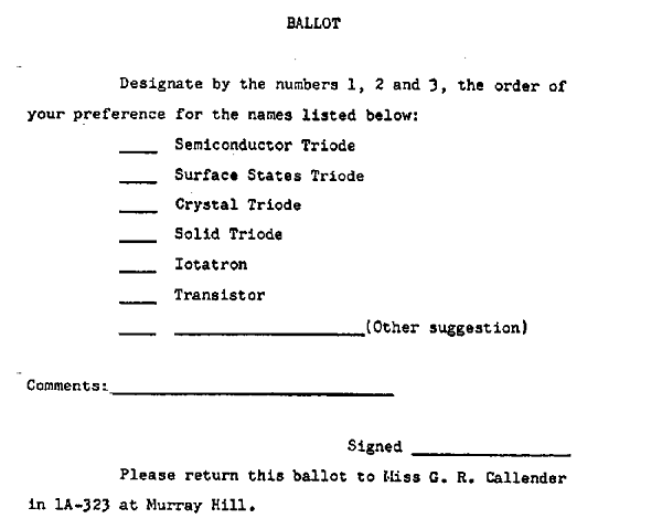 Petya küldte nekem a képet, amely egy 1948-as Bell Laboratories-nál készült emlékeztető részlete. Vezető műszakiaknak küldték szét azzal a felszólítással, hogy szavazzanak, mi legyen az új találmány – a félvezető trióda – neve? Szívesen megnézném, hogy a Iotatron hány szavazatot kapott, volt-e egyéb javaslat és mennyivel nyert a Transistor?