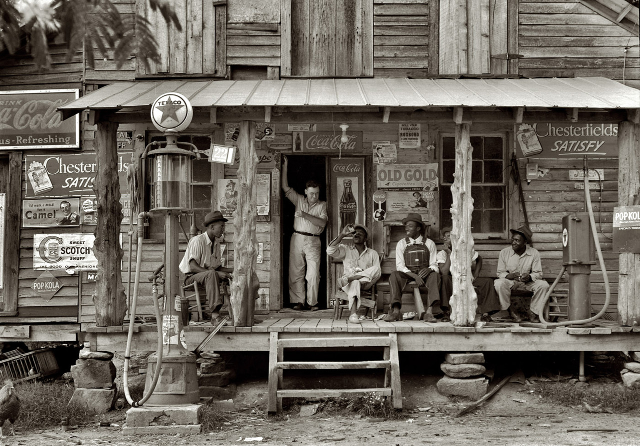 Vasárnap délután a szatócsbolt előtt Dorothea Lange 1939-es felvételén. Az ajtóban a tulaj testvére. Az épület már akkor sem volt túl jó állapotban, de még ma is áll, ahogy a Google Maps Street View képei is igazolják.