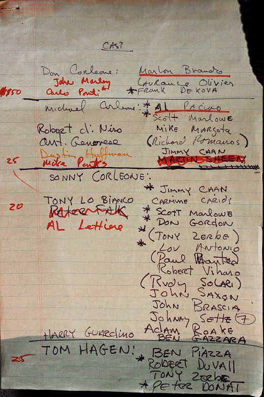 documents, film by mm2013-07-106:29 am Cast Francis Ford Coppola’s handwritten potential cast list for ‘The Godfather’ (1972). Like Loading... Related