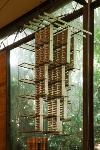 Biblioteca Vasconcelos Mexico City_04 A felülről lelógatott hat emeltnyi polcrendszer és pallók modellje