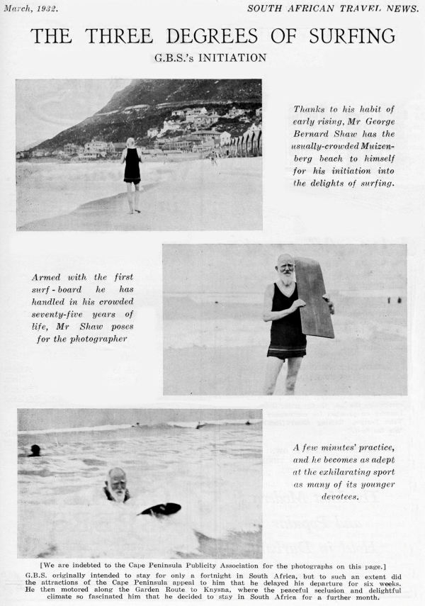 George Bernard Shaw 75 évesen a Muizenberg Beach-en szörfözik. Ezt a képet többször is láttam már, de mindig csak ennyit írtak alá. Fogalmam sem volt, hol lehet Muizenberg és hogy nem átverésről van-e szó. Keresgélni kezdtem és erre az 1932. márciusi gyöngyszemre leltem, amely ‘South Africa Travel News’ fejlccel hálálkodik egy fokvárosi reklám szövetségnek a Shaw-t ábrázoló képekért, köztük ott van az általam már ismert is. Ezek szerint nem átverés – vagy kifinomultabb, mint gondoltam – és a beach Dél-Afrikában van.