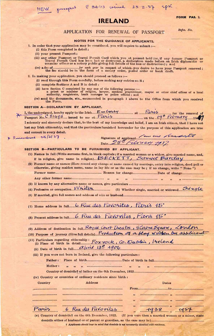 documents by mm2014-03-247:25 pm Beckett’s Application Samuel Beckett’s application for renewal of passport in 1957. Like Loading... Related
