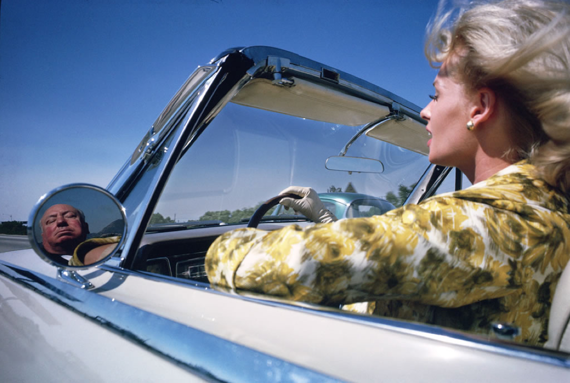 At the end of the day during the filming of ‘The Birds’ (1963) Tippi Hedren drives Alfred Hitchcock home on the 101 freeway in Los Angeles. Photographed by Lawrence Schiller in 1962.
