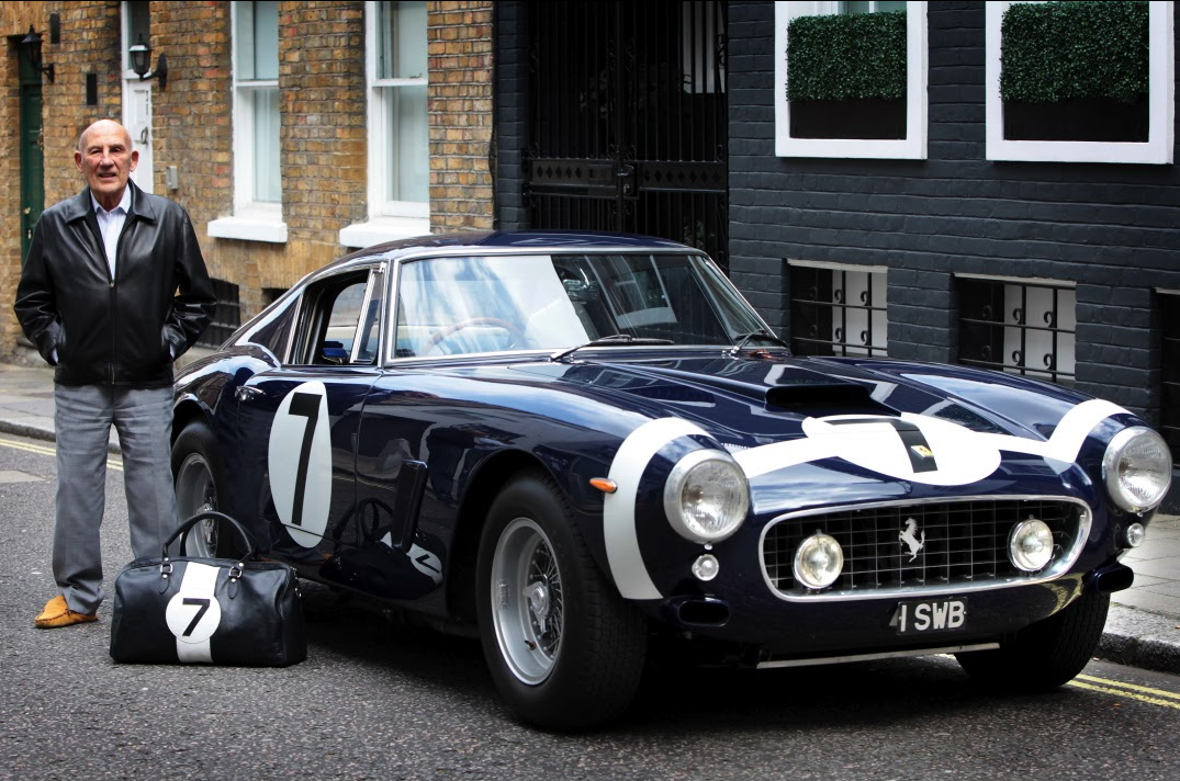 Sir Stirling Moss (2011) and his 1961 Ferrari 250 SWB with a bag that is designed to complement the car and priced at £500. It is made by Italian Caracalla as part of the Commemorative Motorsport Collection, and comes with Moss’ signature embossed on the white center panel and his racing number of the win at the 7th R.A.C Tourist Trophy at Goodwood.