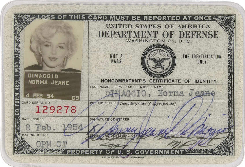 Marilyn Monroe’s Noncombatant’s Certificate of Identity (1954), official qualification to entertain US troops in Korea.