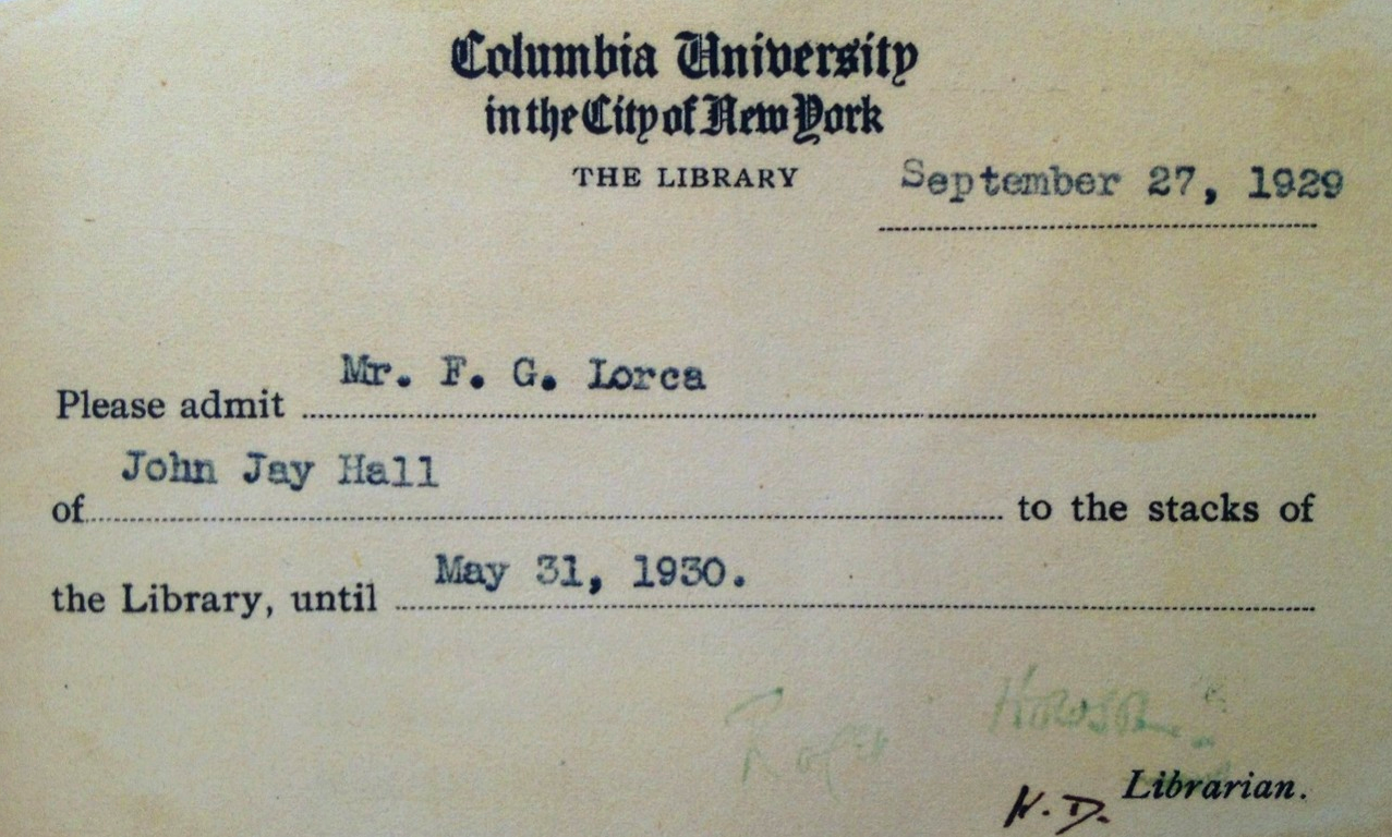 documents by mm2015-01-1210:41 pm Mister Lorca Federico García Lorca’s Columbia University library card (New York, 1929). Like Loading... Related