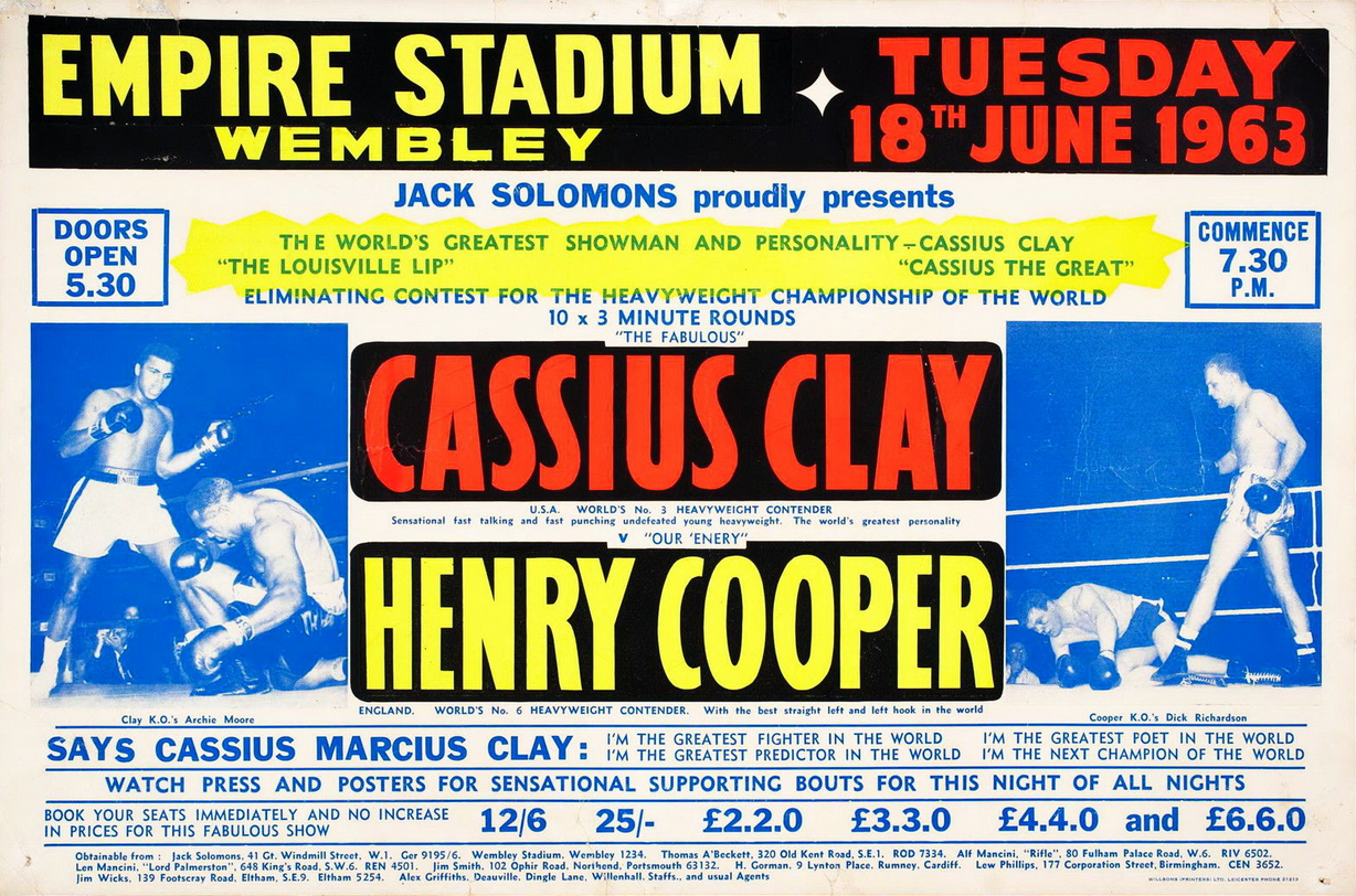 Cassius Clay in London (1963) for a match with Henry Cooper who wasn’t considered to be too dangerous an obstacle to his aspirations to be world heavyweight champion.