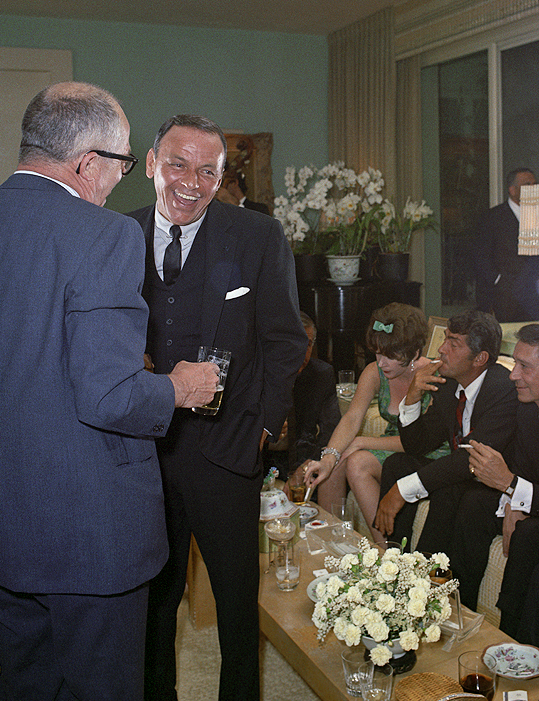 Frank Sinatra talking with Billy Wilder at the wedding party after his marriage to Mia Farrow in 1966. Shirley MacLaine and Dean Martin are also seen in the background.