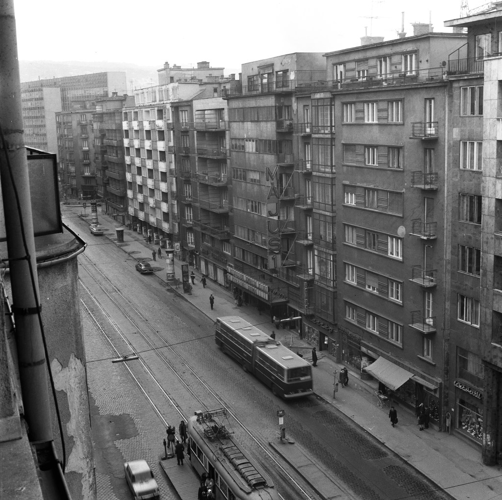 Margit körút (Mártírok útja) a Keleti Károly utcától a Fényes Elek utca felé nézve 1972-ben. A Május 1 mozi műsorán ‘A kőszívű ember fiai’ és ‘Fellini Róma’ (Nagy Gyula, Fortepan #60050).