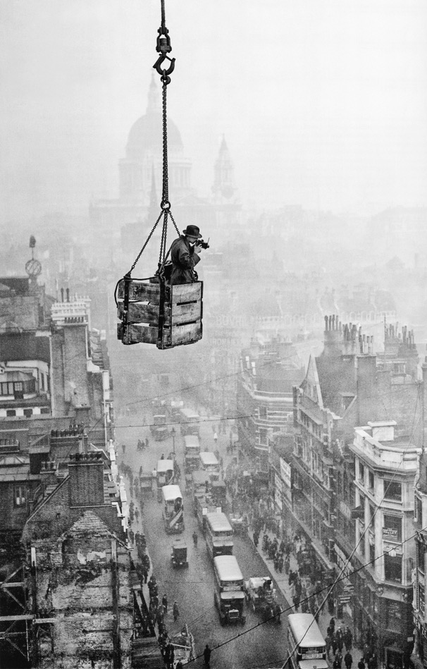 Fox photographer RJ Salmon dangles in a crate suspended from a crane to take an aerial shot of Fleet Street, London, with St. Paul’s in the background. The picture is taken from the daily telegraph building | 1929