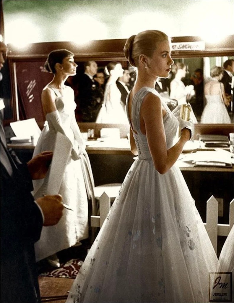 Audrey Hepburn and Grace Kelly backstage at the 1956 Academy Awards. They both won the Best Actress Award in previous years. Audrey Hepburn won for ‘Roman Holiday’ in 1953 while Grace Kelly won for ‘The Country Girl’ in 1954.