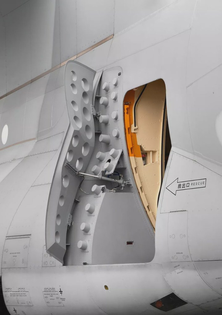 Left paradrop door of the Kawasaki C-2 mid-size, twin-turbofan engine, long range, high speed military transport aircraft developed and manufactured by Kawasaki Aerospace Company. The plane is deployed by the Japan Air Self-Defense Force (JASDF).